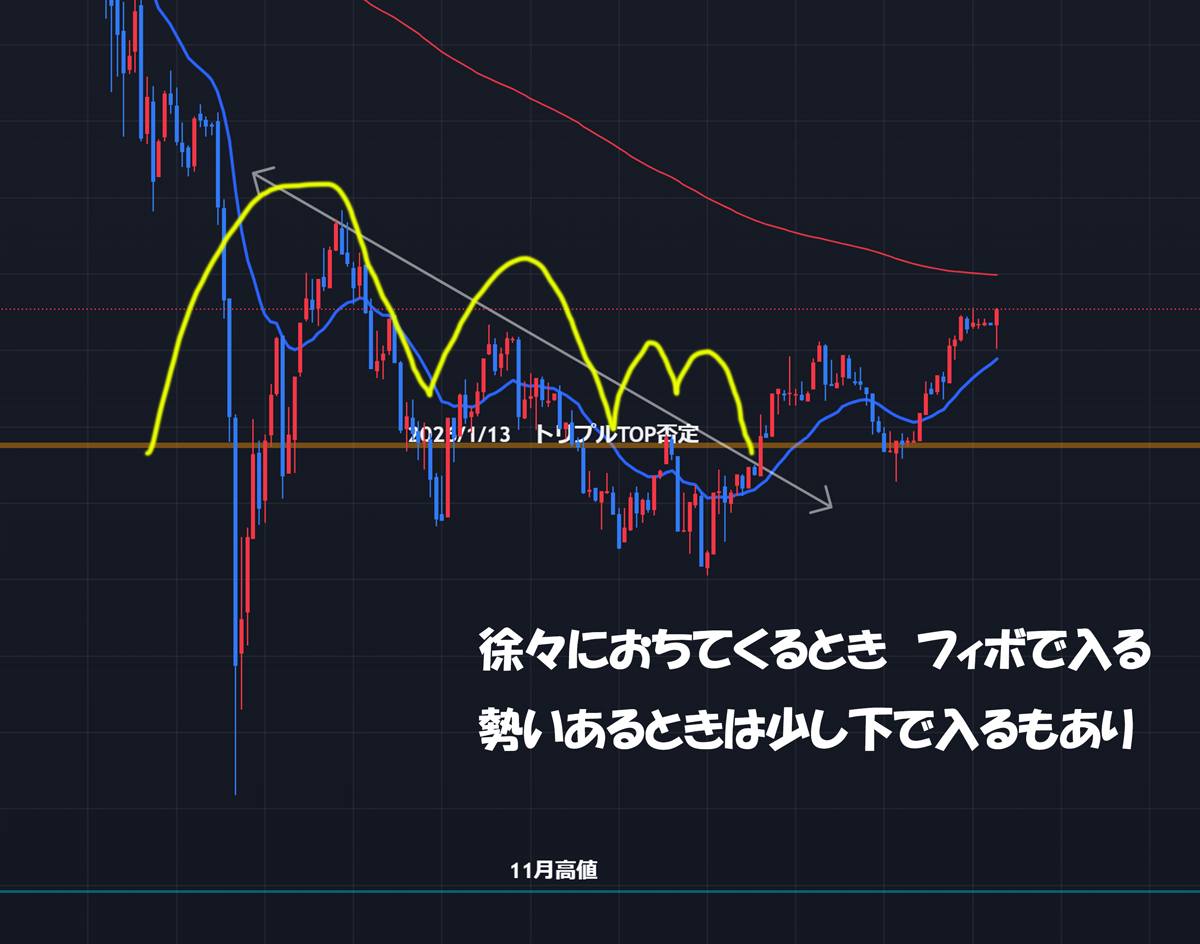上から下は根拠崩れたら建値(一回建値で切って入りなおすでもOK)(フィボで入ってれば落ちてきたら2回目フィボになるからmaなど注意)